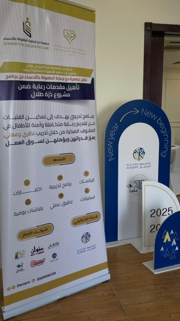 اختتمت جمعية درر لرعاية الطفولة اليوم الاثنين، الموافق 10 نوفمبر، في مقر الجمعية بالأحساء، المرحلةَ النظرية من برنامج تأهيل مقدمات الرعاية، أحد مبادرات مشروع “دُرّة طلال”، والمنفَّذ بدعمٍ كريم من مؤسسة الأمير عبدالعزيز بن طلال وسرى بنت سعود للتنمية الإنسانية.